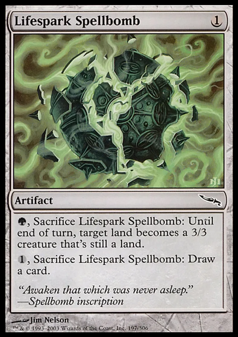 | Oracle Text | {{g}}, Sacrifice Lifespark Spellbomb: Until end of turn, target land becomes a 3/3 creature that's still a land. {{1}}, Sacrifice Lifespark Spellbomb: Draw a card. | ||
