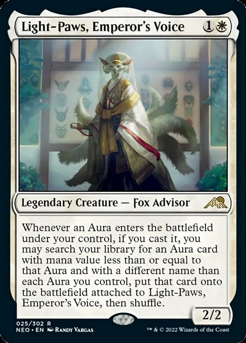 | Oracle Text | Whenever an Aura enters the battlefield under your control, if you cast it, you may search your library for an Aura card with mana value less than or equal to that Aura and with a different name than each Aura you control, put that card onto the battlefield attached to Light-Paws, Emperor's Voice, then shuffle. | ||