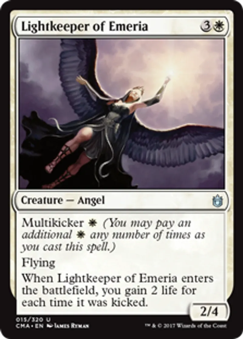 | Oracle Text | Multikicker {{w}} (You may pay an additional {{w}} any number of times as you cast this spell.) Flying When Lightkeeper of Emeria enters the battlefield, you gain 2 life for each time it was kicked. | ||