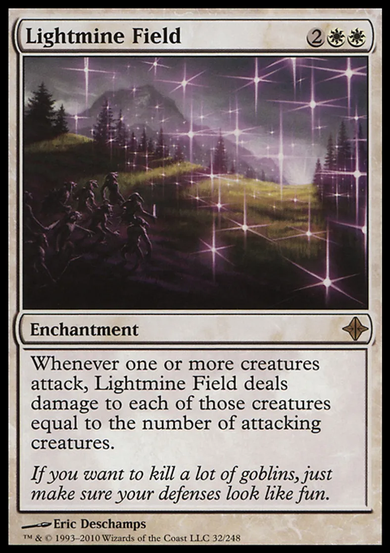 | Oracle Text | Whenever one or more creatures attack, Lightmine Field deals damage to each of those creatures equal to the number of attacking creatures. | ||