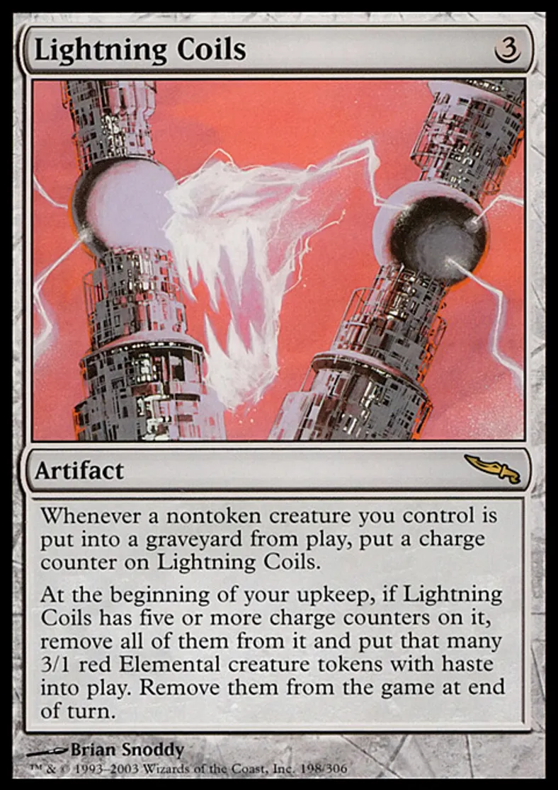 | Oracle Text | Whenever a nontoken creature you control dies, put a charge counter on Lightning Coils. At the beginning of your upkeep, if Lightning Coils has five or more charge counters on it, remove all of them from it and put that many 3/1 red Elemental creature tokens with haste onto the battlefield. Exile them at the beginning of the next end step. | ||