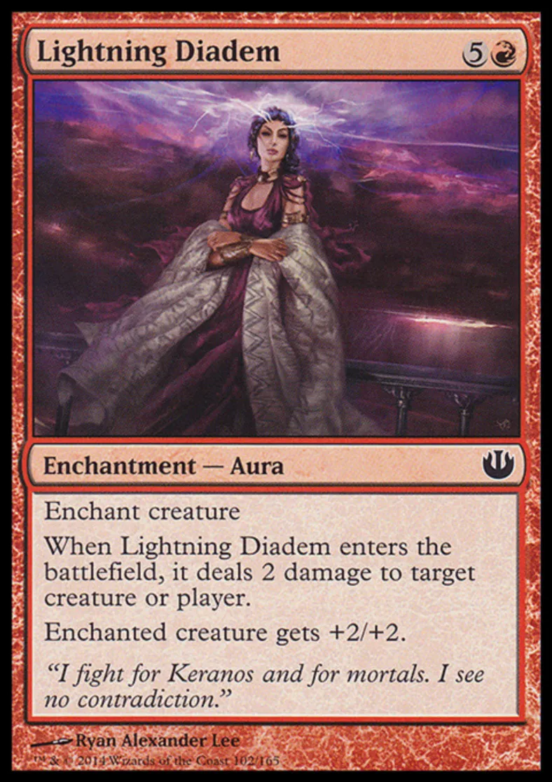 | Oracle Text | Enchant creature When Lightning Diadem enters the battlefield, it deals 2 damage to target creature or player. Enchanted creature gets +2/+2. | ||