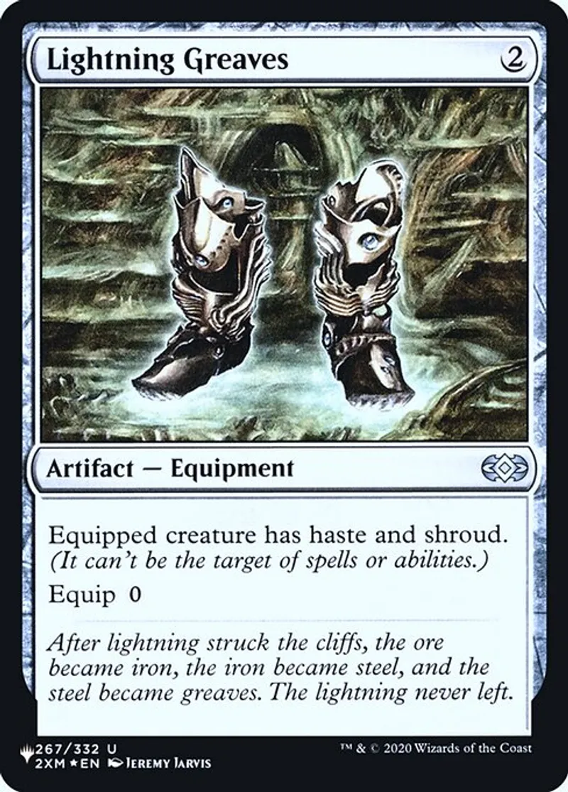 | Flavor Text | After lightning struck the cliffs, the ore became iron, the iron became steel, and the steel became greaves. The lightning never left. | ||