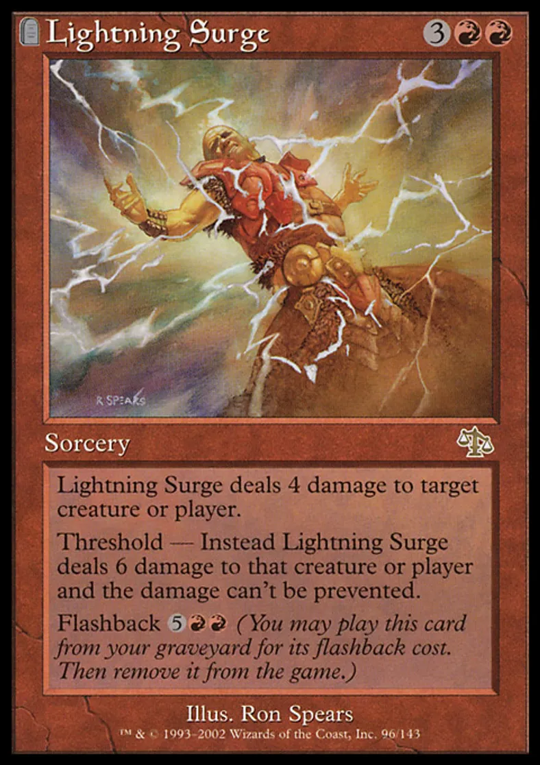 | Oracle Text | Lightning Surge deals 4 damage to target creature or player. Threshold — If seven or more cards are in your graveyard, instead Lightning Surge deals 6 damage to that creature or player and the damage can't be prevented. Flashback {{5}}{{r}}{{r}} (You may cast this card from your graveyard for its flashback cost. Then exile it.) | ||