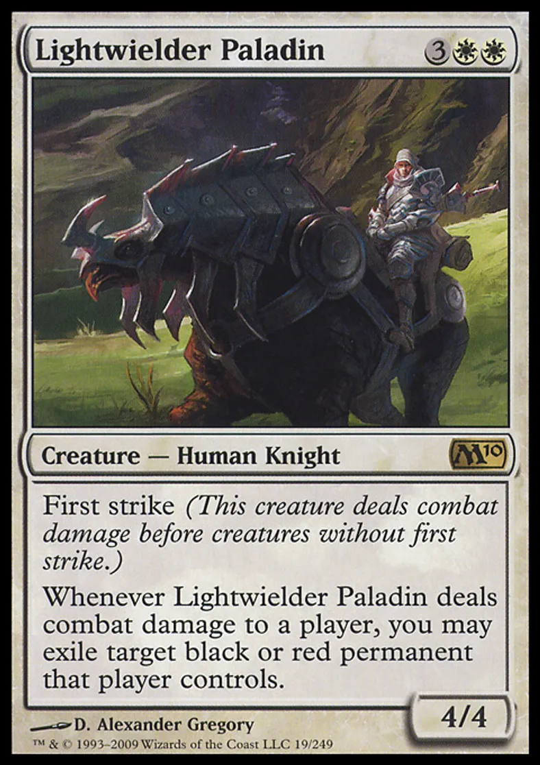 | Oracle Text | First strike (This creature deals combat damage before creatures without first strike.) Whenever Lightwielder Paladin deals combat damage to a player, you may exile target black or red permanent that player controls. | ||