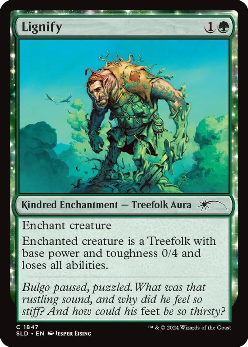 Magic: the Gathering (mtg) Common kindred enchantment — treefolk aura Lignify from Secret Lair Drop Series (SLD) last updated 2026-01-31 17:34:36