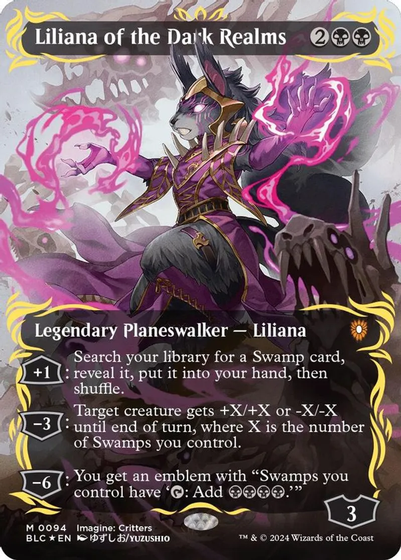 Liliana of the Dark Realms (Borderless) (Raised Foil) is a Mythic Rare in the set Commander: Bloomburrow.