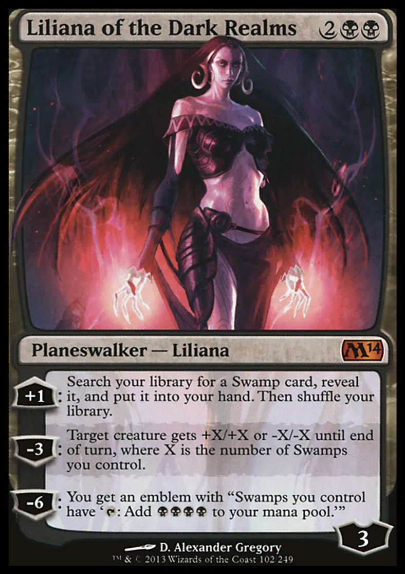 Liliana of the Dark Realms is a Mythic Rare in the set Magic 2014 Core Set.