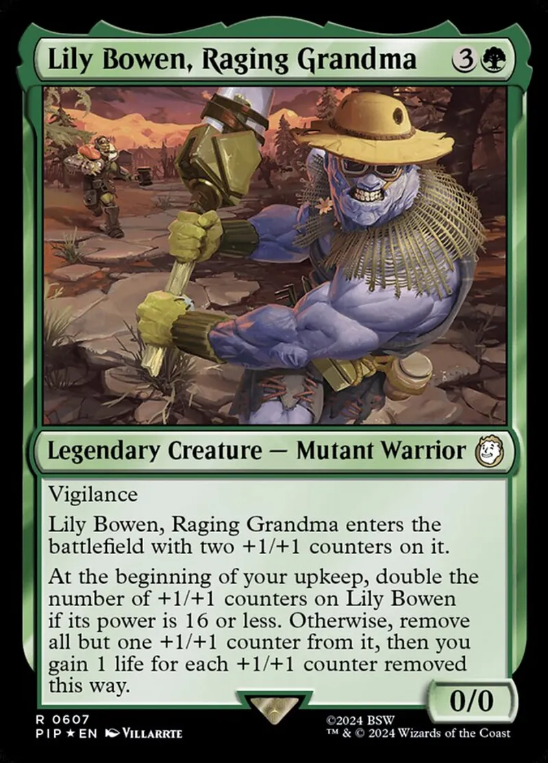 Magic: the Gathering (mtg) rare Legendary Creature — Mutant Warrior Lily Bowen, Raging Grandma from Universes Beyond: Fallout (pip) last updated 2025-12-13 15:57:31