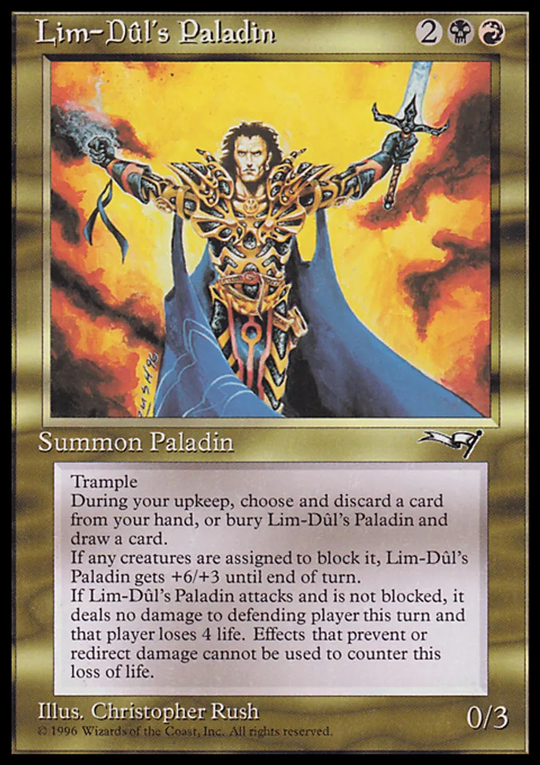 | Oracle Text | Trample At the beginning of your upkeep, you may discard a card. If you don't, sacrifice Lim-Dûl's Paladin and draw a card. Whenever Lim-Dûl's Paladin becomes blocked, it gets +6/+3 until end of turn. Whenever Lim-Dûl's Paladin attacks and isn't blocked, it assigns no combat damage to defending player this turn and that player loses 4 life. | ||