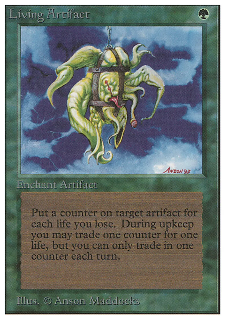 | Oracle Text | Enchant artifact Whenever you're dealt damage, put that many vitality counters on Living Artifact. At the beginning of your upkeep, you may remove a vitality counter from Living Artifact. If you do, you gain 1 life. | ||