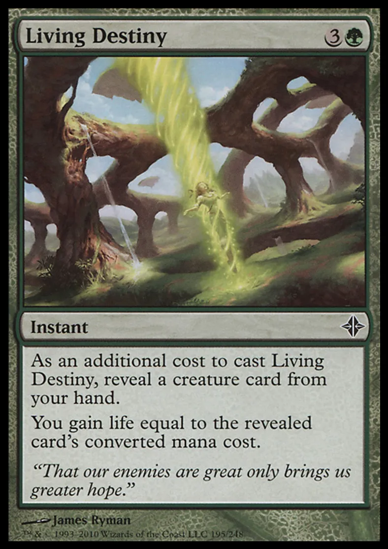| Oracle Text | As an additional cost to cast Living Destiny, reveal a creature card from your hand. You gain life equal to the revealed card's converted mana cost. | ||