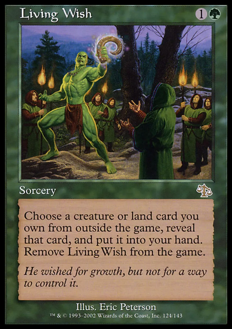 | Oracle Text | You may choose a creature or land card you own from outside the game, reveal that card, and put it into your hand. Exile Living Wish. | ||