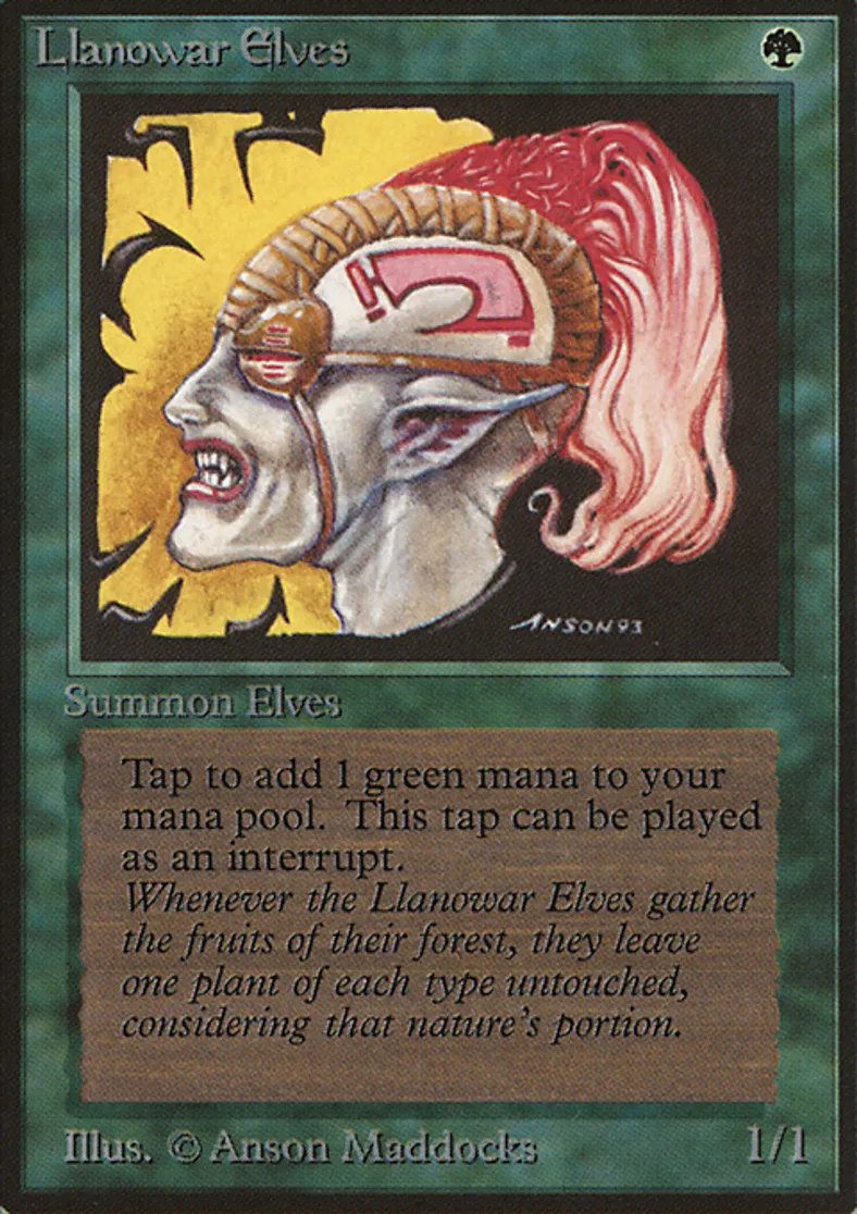 | Flavor Text | Whenever the Llanowar Elves gather the fruits of their forest, they leave one plant of each type untouched, considering that nature's portion. | ||