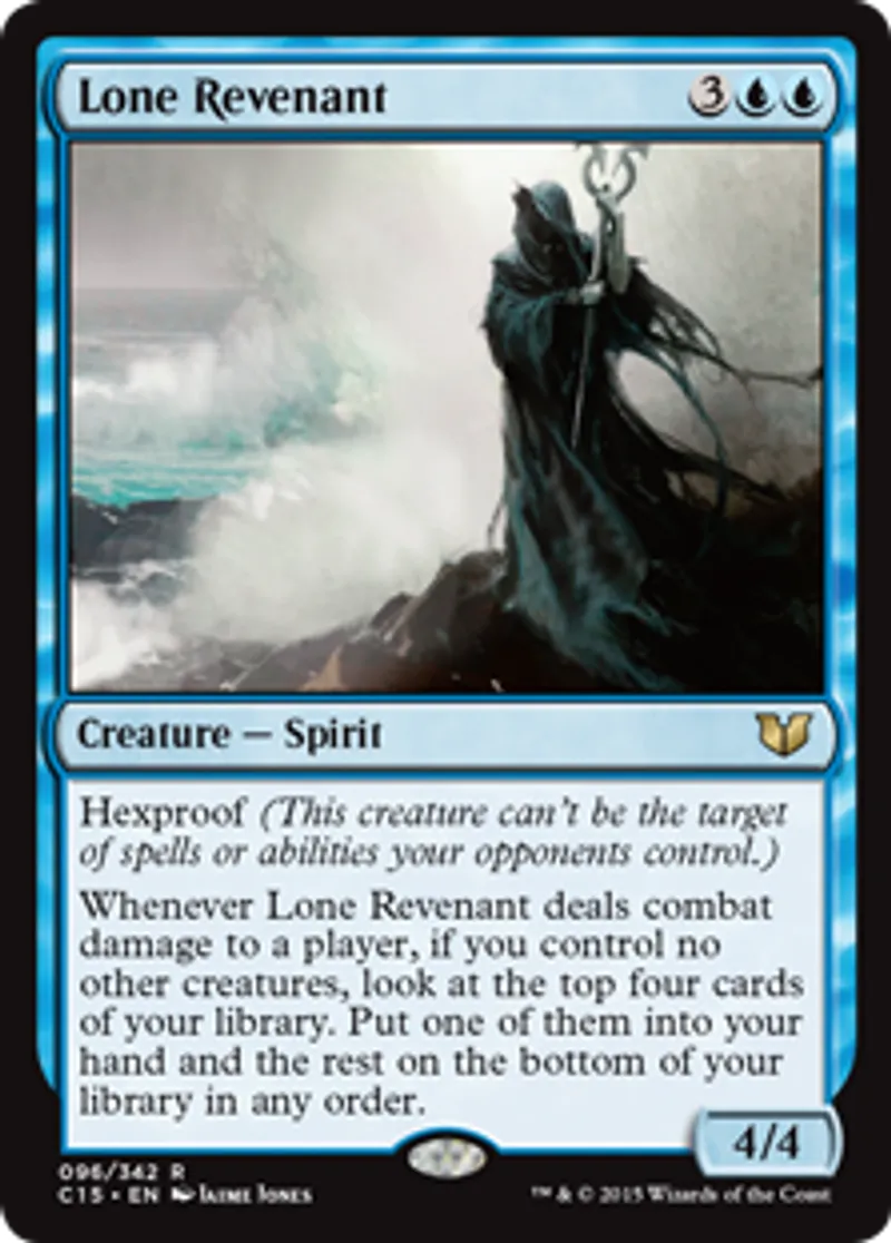 | Oracle Text | Hexproof (This creature can't be the target of spells or abilities your opponents control.) Whenever Lone Revenant deals combat damage to a player, if you control no other creatures, look at the top four cards of your library. Put one of them into your hand and the rest on the bottom of your library in any order. | ||