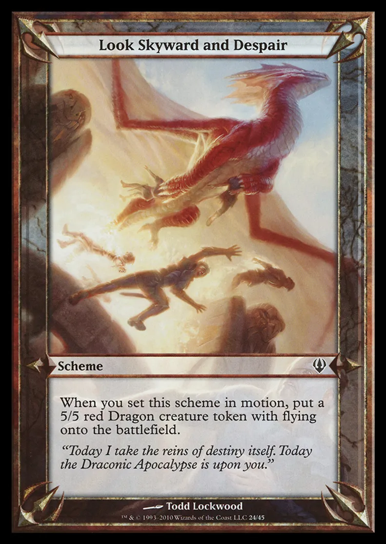 | Oracle Text | When you set this scheme in motion, put a 5/5 red Dragon creature token with flying onto the battlefield. | ||