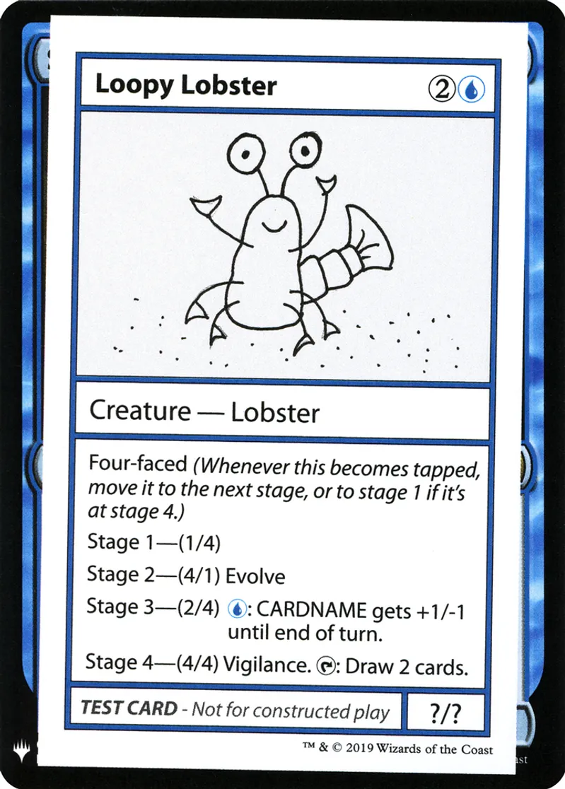 | Oracle Text | Four-faced (Whenever this becomes tapped, move it to the next stage, or to stage 1 if it’s at stage 4.)\r\n\r\nStage 1—(1/4)\r\n\r\nStage 2—(4/1) Evolve\r\n\r\nStage 3—(2/4) {U}: Loopy Lobster gets +1/-1 until end of turn.\r\n\r\nStage 4—(4/4) Vigilance. {T}: Draw two cards. | ||