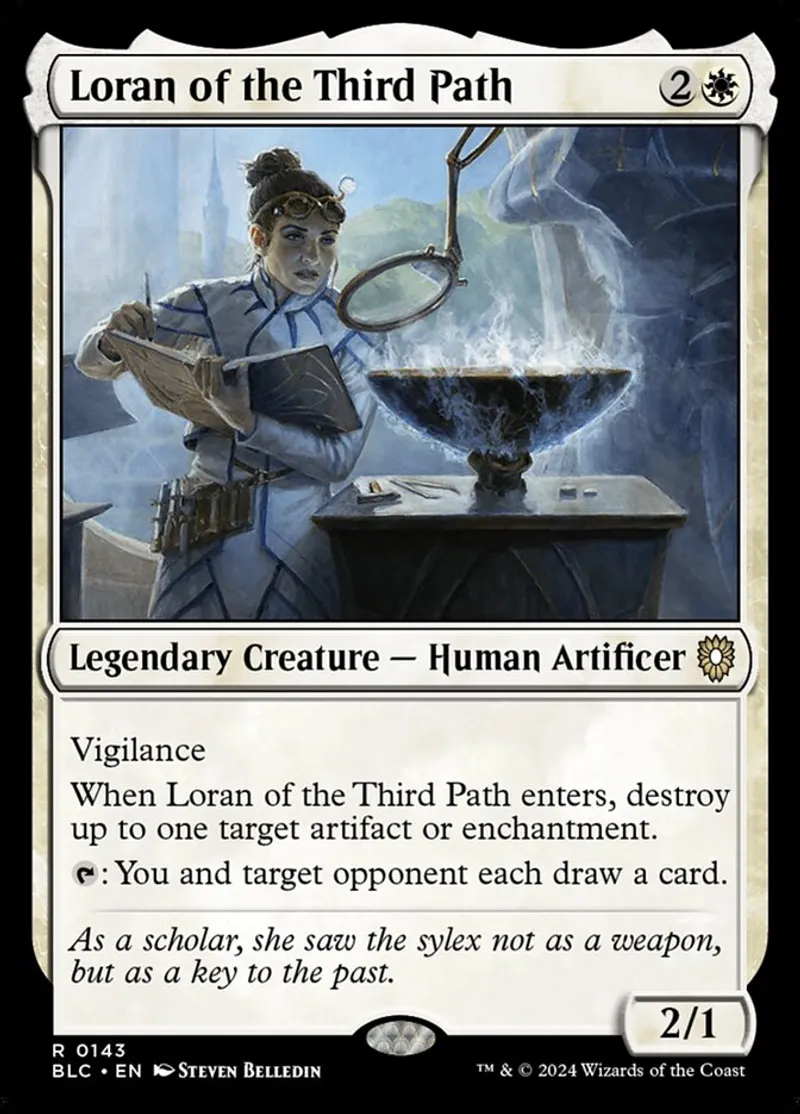 Magic: the Gathering (mtg) rare Legendary Creature — Human Artificer Loran of the Third Path from Bloomburrow Commander (blc) last updated 2026-02-25 14:49:36