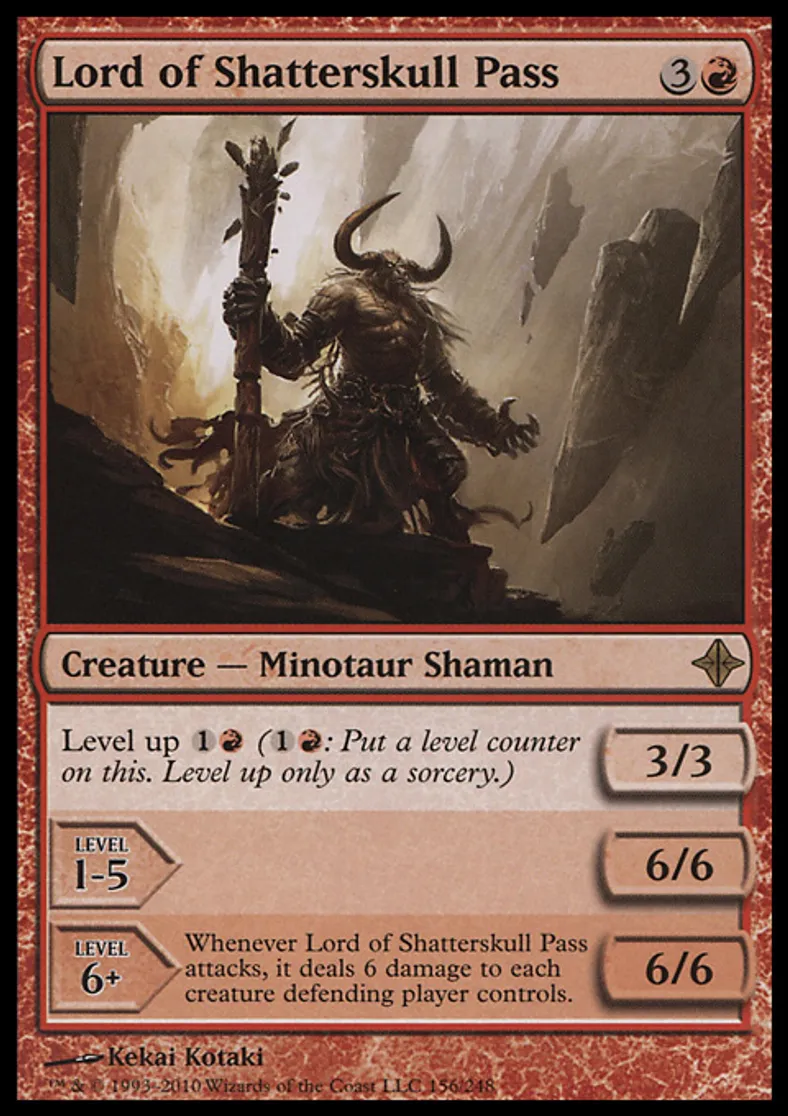| Oracle Text | Level up {{1}}{{r}} ({{1}}{{r}}: Put a level counter on this. Level up only as a sorcery.) LEVEL 1-5 6/6 LEVEL 6+ 6/6 Whenever Lord of Shatterskull Pass attacks, it deals 6 damage to each creature defending player controls. | ||