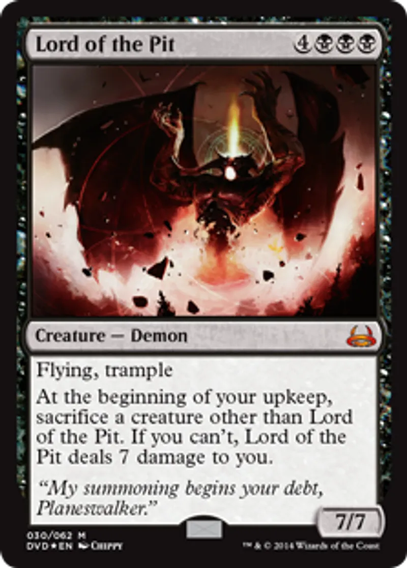 | Oracle Text | Flying, trample At the beginning of your upkeep, sacrifice a creature other than Lord of the Pit. If you can't, Lord of the Pit deals 7 damage to you. | ||