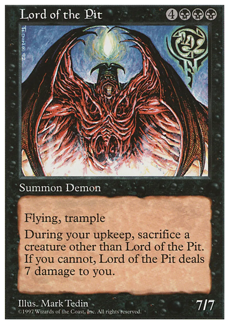 | Oracle Text | Flying, trample At the beginning of your upkeep, sacrifice a creature other than Lord of the Pit. If you can't, Lord of the Pit deals 7 damage to you. | ||