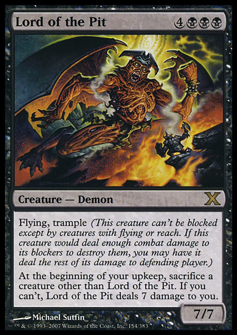 | Oracle Text | Flying, trample At the beginning of your upkeep, sacrifice a creature other than Lord of the Pit. If you can't, Lord of the Pit deals 7 damage to you. | ||