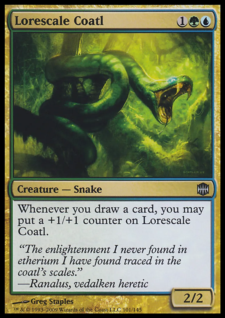 | Oracle Text | Whenever you draw a card, you may put a +1/+1 counter on Lorescale Coatl. | ||