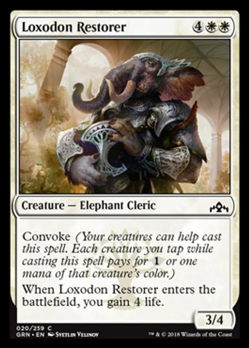| Oracle Text | Convoke (Your creatures can help cast this spell. Each creature you tap while casting this spell pays for {{1}} or one mana of that creature's color.) When Loxodon Restorer enters the battlefield, you gain 4 life. | ||