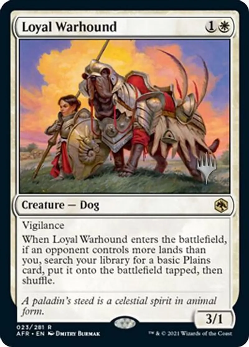 When Loyal Warhound enters the battlefield, if an opponent controls more lands than you, search your library for a basic Plains card, put it onto the battlefield tapped, then shuffle. | ||