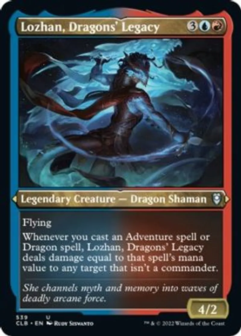 Whenever you cast an Adventure spell or Dragon spell, Lozhan, Dragons' Legacy deals damage equal to that spell's mana value to any target that isn't a commander. | ||