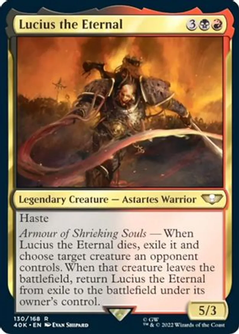 Armour of Shrieking Souls — When Lucius the Eternal dies, exile it and choose target creature an opponent controls. When that creature leaves the battlefield, return Lucius the Eternal from exile to the battlefield under its owner’s control. | ||
