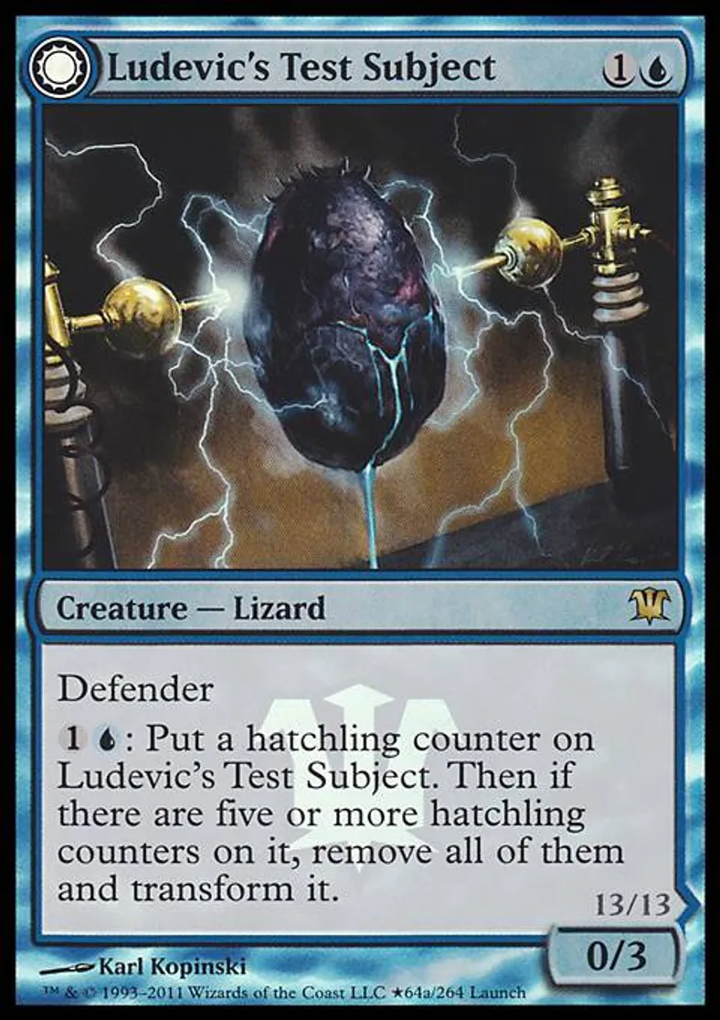 | Oracle Text | Defender {{1}}{{U}}: Put a hatchling counter on Ludevic's Test Subject. Then if there are five or more hatchling counters on it, remove all of them and transform it. | ||
