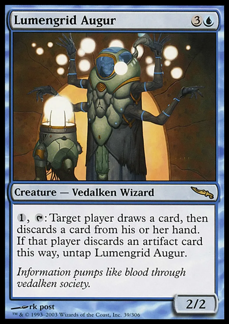 | Oracle Text | {{1}}, {{t}}: Target player draws a card, then discards a card. If that player discards an artifact card this way, untap Lumengrid Augur. | ||