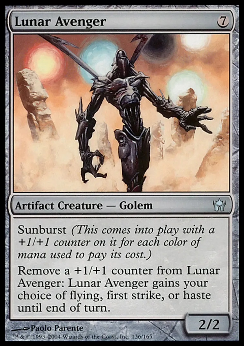 | Oracle Text | Sunburst (This enters the battlefield with a +1/+1 counter on it for each color of mana spent to cast it.) Remove a +1/+1 counter from Lunar Avenger: Lunar Avenger gains your choice of flying, first strike, or haste until end of turn. | ||