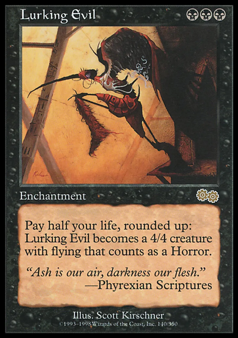 | Oracle Text | Pay half your life, rounded up: Lurking Evil becomes a 4/4 Horror creature with flying. | ||
