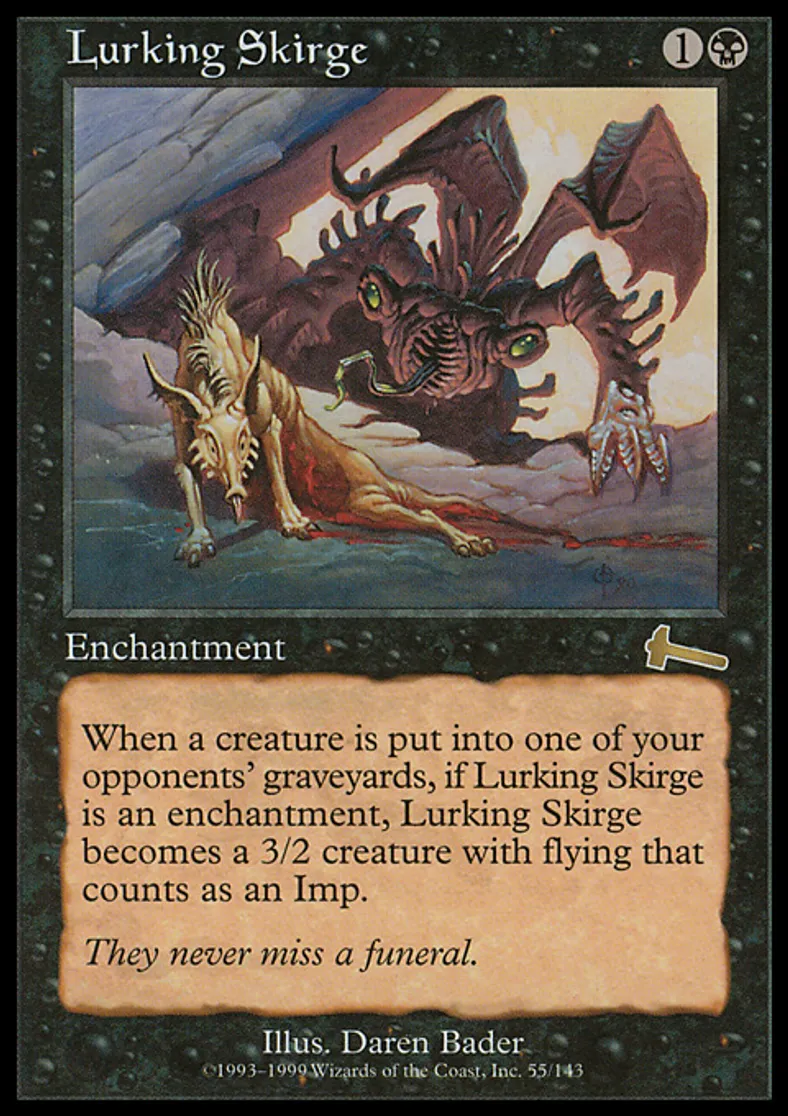 | Oracle Text | When a creature is put into an opponent's graveyard from the battlefield, if Lurking Skirge is an enchantment, Lurking Skirge becomes a 3/2 Imp creature with flying. | ||