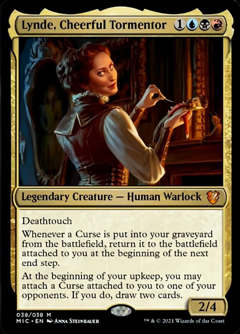Lynde, Cheerful Tormentor is a mythic in the set Commander: Innistrad: Midnight Hunt.