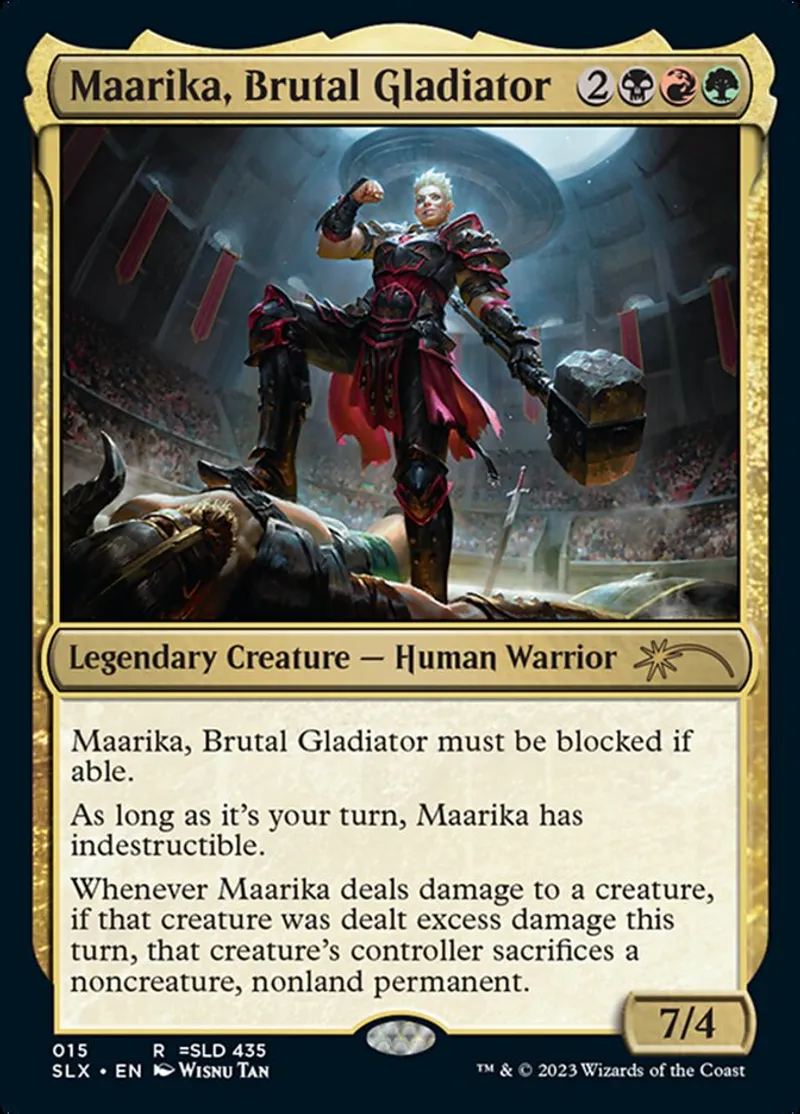 Magic: the Gathering (mtg) Rare Legendary Creature — Human Warrior Maarika, Brutal Gladiator from Universes Within (SLX) last updated 2026-02-25 14:56:32