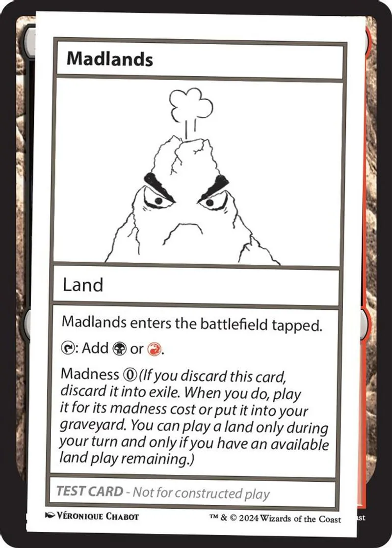 | Oracle Text | madlands enters the battlefield tapped. t: add b or r. madness 0 (if you discard this card, discard it into exile. when you do, play it for its madness cost or put it into your graveyard. you can play a land only during your turn and only if you have an available land play remaining.) | ||