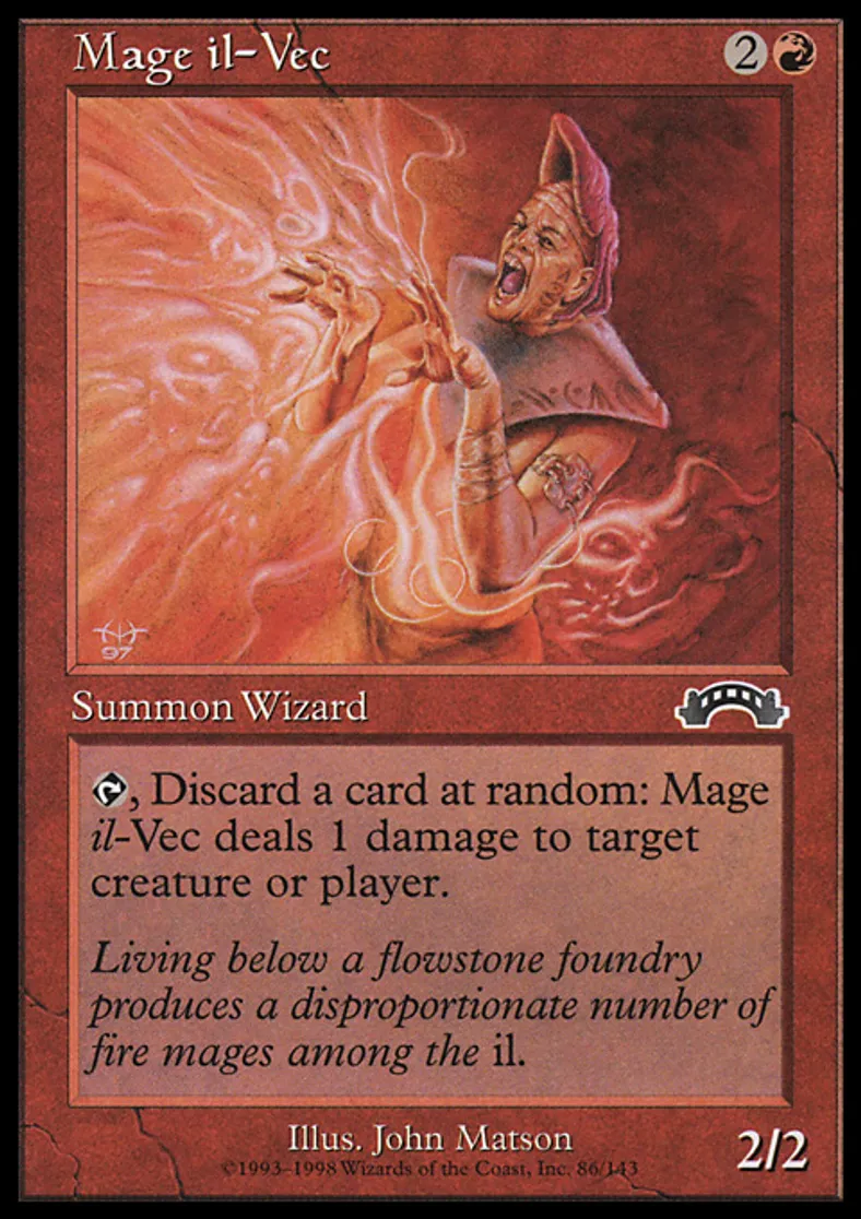 | Oracle Text | {{t}}, Discard a card at random: Mage il-Vec deals 1 damage to target creature or player. | ||