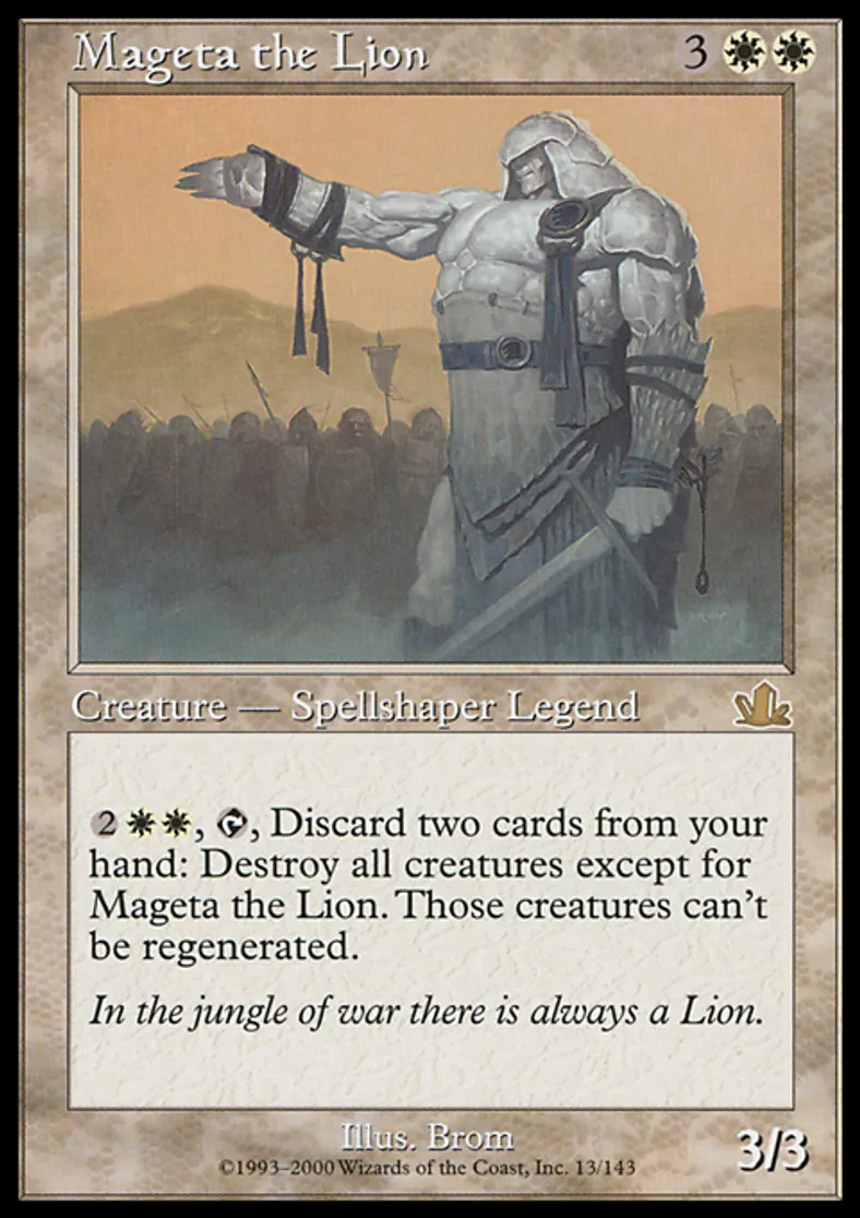 | Oracle Text | {{2}}{{w}}{{w}}, {{t}}, Discard two cards: Destroy all creatures except for Mageta the Lion. Those creatures can't be regenerated. | ||