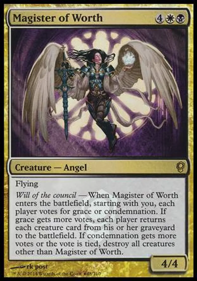Will of the council — When Magister of Worth enters the battlefield, starting with you, each player votes for grace or condemnation. If grace gets more votes, each player returns each creature card from his or her graveyard to the battlefield. If condemnation gets more votes or the vote is tied, destroy all creatures other than Magister of Worth. | ||