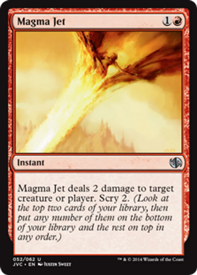| Oracle Text | Magma Jet deals 2 damage to target creature or player. Scry 2. (Look at the top two cards of your library, then put any number of them on the bottom of your library and the rest on top in any order.) | ||