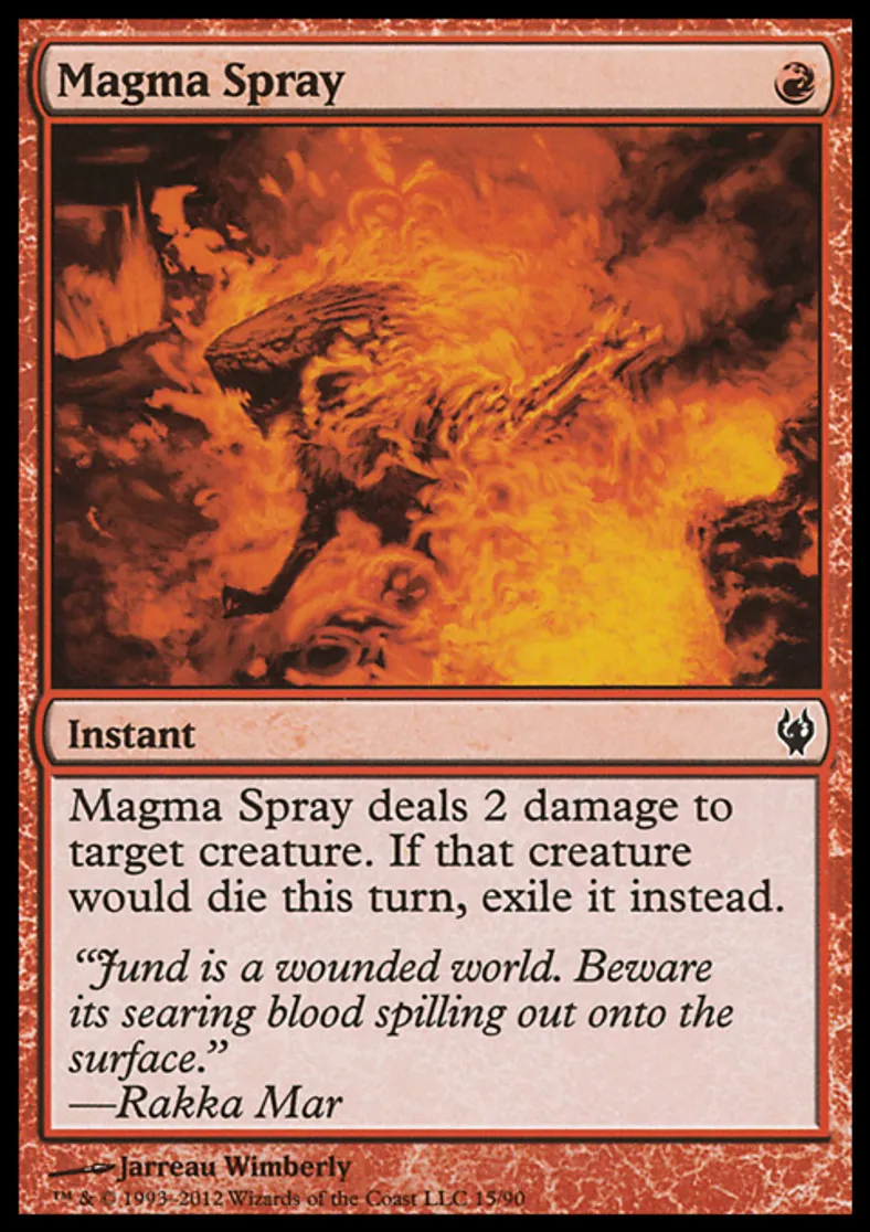 | Oracle Text | Magma Spray deals 2 damage to target creature. If that creature would die this turn, exile it instead. | ||
