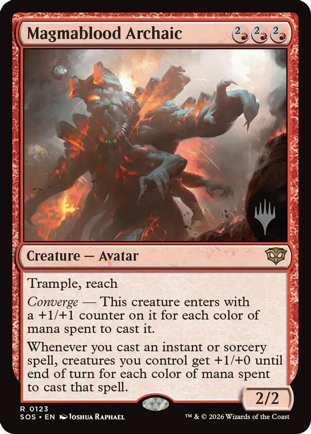 Magic: the Gathering (mtg) Rare creature — avatar Magmablood Archaic from Promo Pack: Secrets of Strixhaven (PPSOS) last updated 2026-04-18 15:21:10