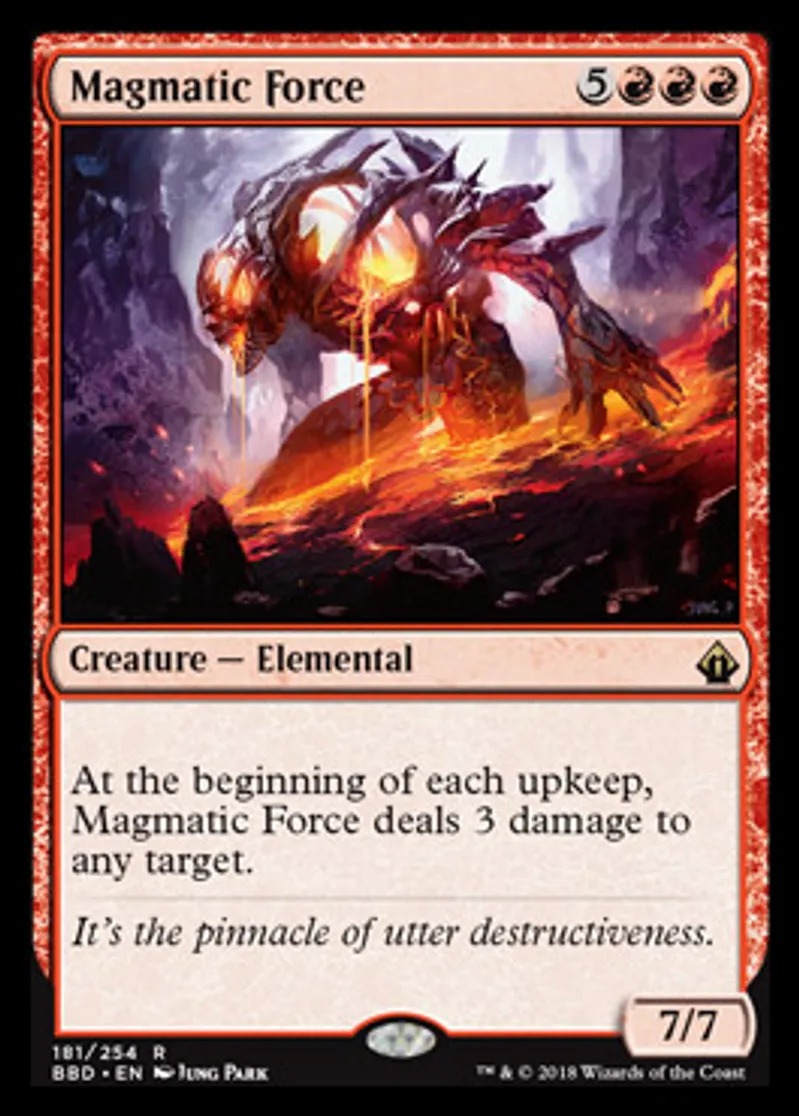 | Oracle Text | At the beginning of each upkeep, Magmatic Force deals 3 damage to any target. | ||