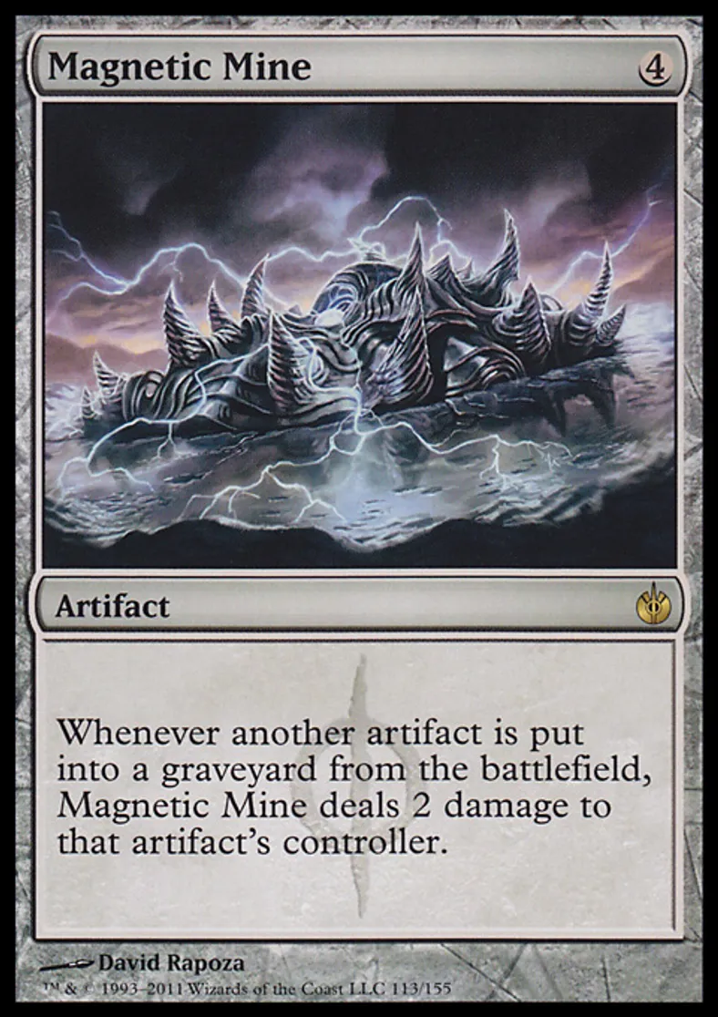 | Oracle Text | Whenever another artifact is put into a graveyard from the battlefield, Magnetic Mine deals 2 damage to that artifact's controller. | ||