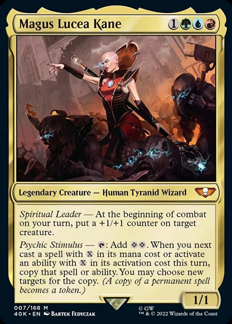 Magic: the Gathering (mtg) mythic Legendary Creature — Human Tyranid Wizard Magus Lucea Kane from Warhammer 40,000 (40K) last updated 2026-02-25 15:39:02