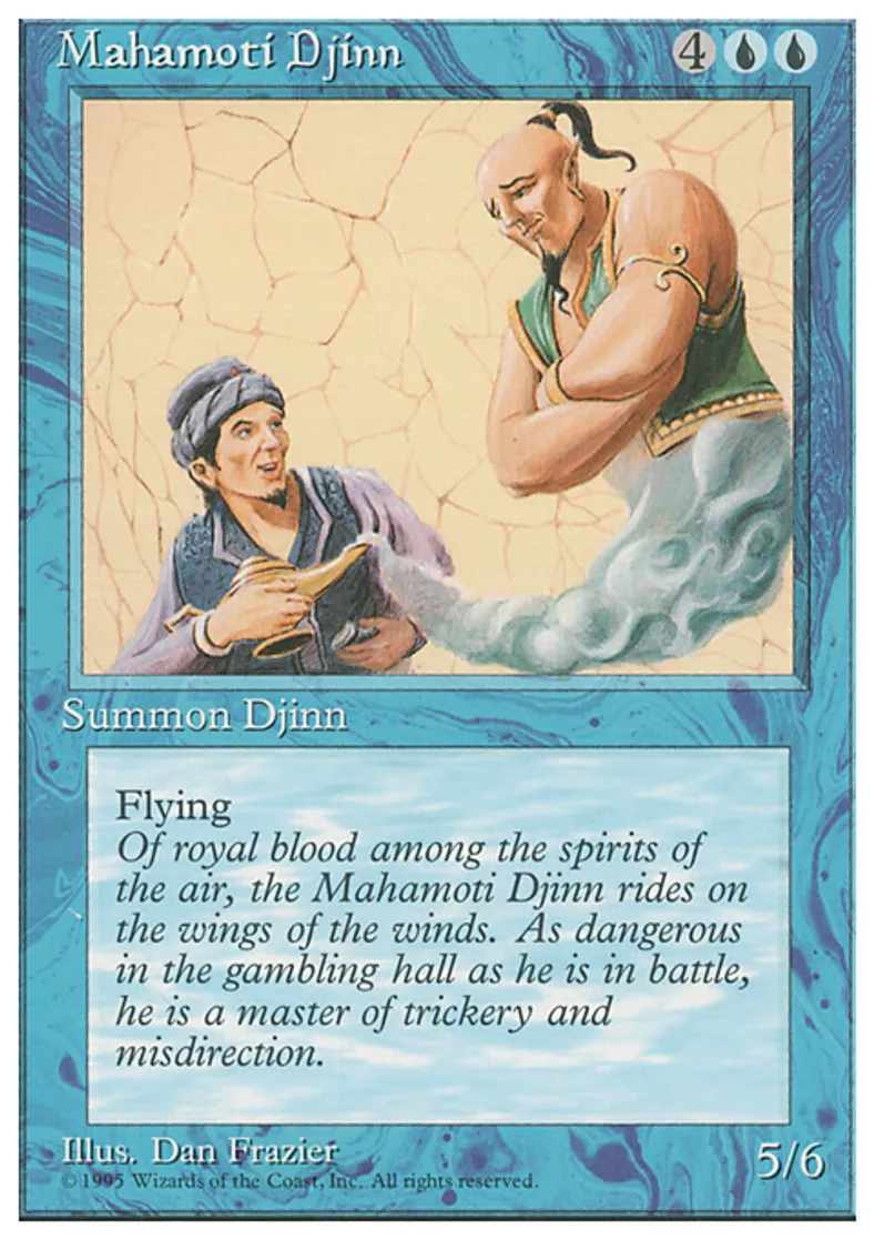 | Flavor Text | Of royal blood among the spirits of the air, the Mahamoti Djinn rides on the wings of the winds. As dangerous in the gambling hall as he is in battle, he is a master of trickery and misdirection. | ||
