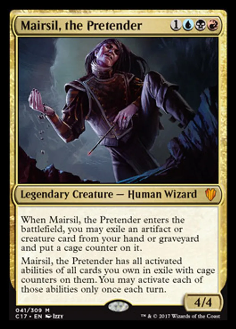 | Oracle Text | When Mairsil, the Pretender enters the battlefield, you may exile an artifact or creature card from your hand or graveyard and put a cage counter on it. Mairsil, the Pretender has all activated abilities of all cards you own in exile with cage counters on them. You may activate each of those abilities only once each turn. | ||